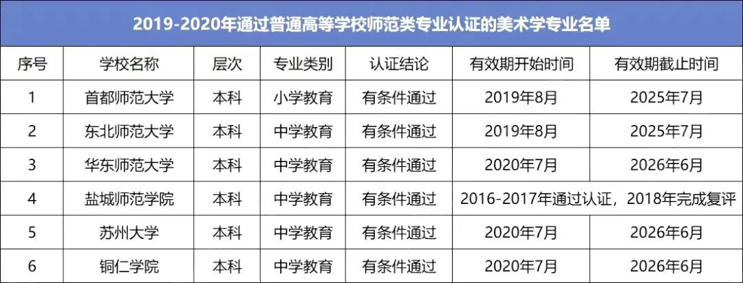 而国内一些师范类专业认证工作于2018年初正式启动,截至目前共有10家认证机构组织实施的221个专业通过了认证,包括学前教育、小学教育、中学教育三类。以上表格里的专业均已全部通过第二级认证,而这些师范类美术学毕业生,可由高校自行组织中小学教师资格考试面试工作。