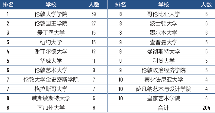 留学目的地排名前三名的国家为英国(202 人)、美国(97 人)和日本(18 人)。