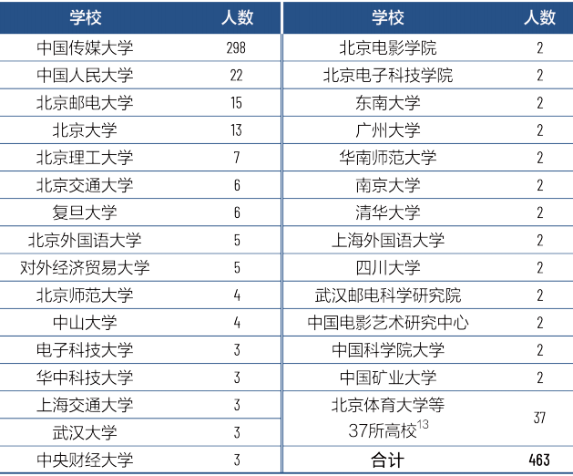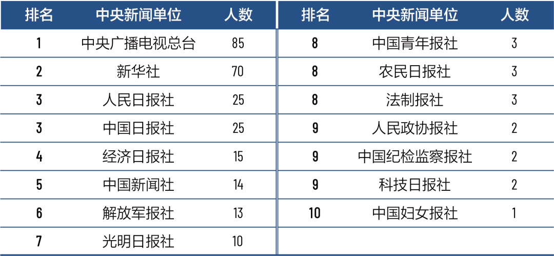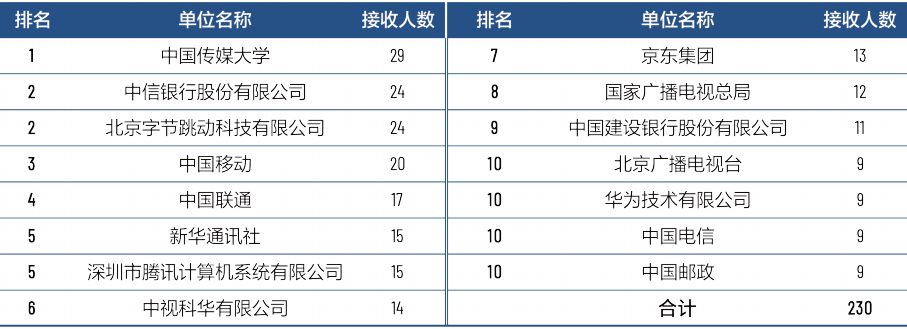 近三年来接收学校毕业生人数前 10 位的中央新闻单位: