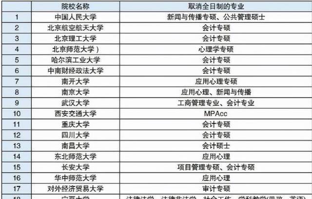 更具网友整理的内容来看,不少985院校都取消了一定数量的全日制专业。以中国人民大学为例,在2021年研究生招生中取消了新闻与传播专硕、公共管理硕士两个专业。
