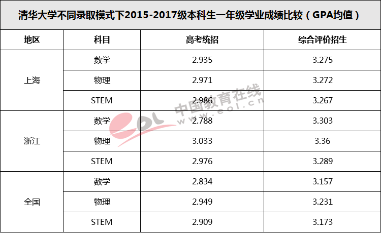 分析发现,通过综合评价招生模式录取的学生,在本科一年级数学、物理和STEM课程的平均成绩上几乎全面优于高考统招录取的学生。清华大学招生办公室余潇潇和徐宁汉认为,这表面上与学生对大学第一年的学业适应程度有关,通过综合评价招生录取的学生进行了综合素质考核,具备多方面的特点,适应度较高;但进一步分析发现,这也与综合评价招生对学生高考选科和高中大学学业的衔接有关。【《沪浙高考综合改革实施方案的实效探究——基于清华大学一年级本科生学业成绩的实证分析》 余潇潇、徐宁汉】